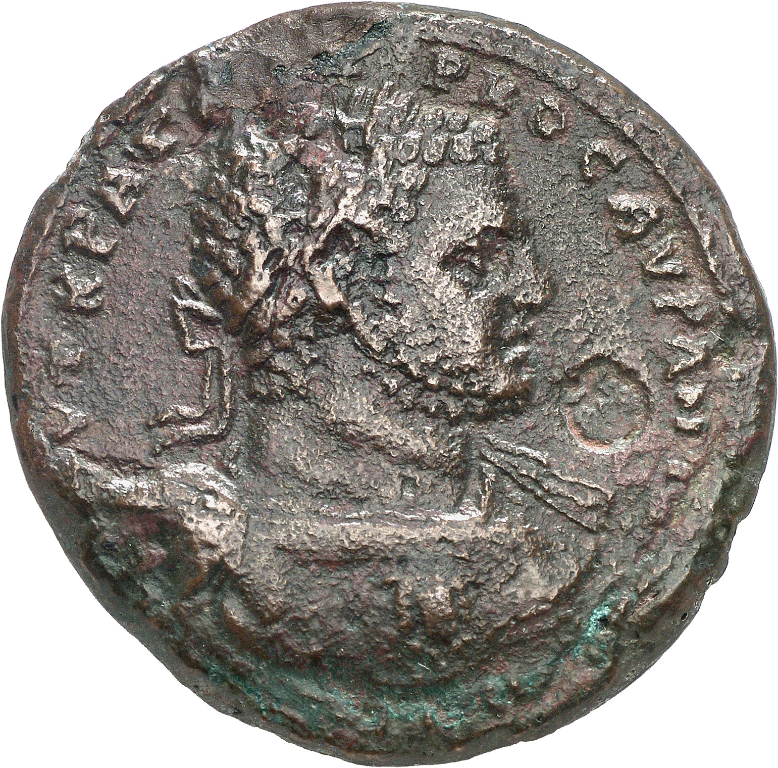 Laureate bust of bearded Caracalla, right, wearing cuirass and paludamentum.