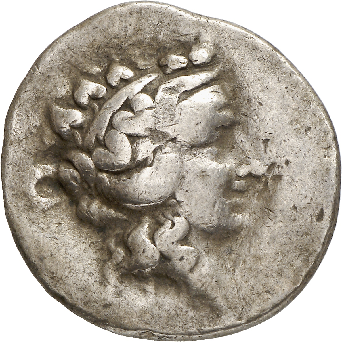 Head of (youthful) Dionysus, right, wearing ivy wreath with berries.