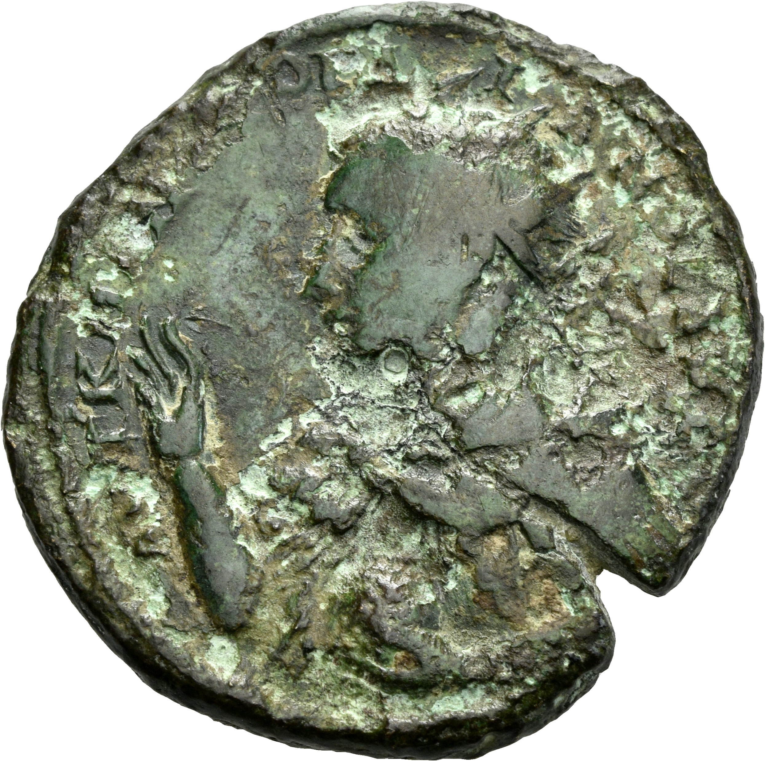 Radiate bust of Gordian III, left, seen from front, wearing cuirass and paludamentum; gorgoneion on breastplate; right hand raised, holding globe in the left hand.